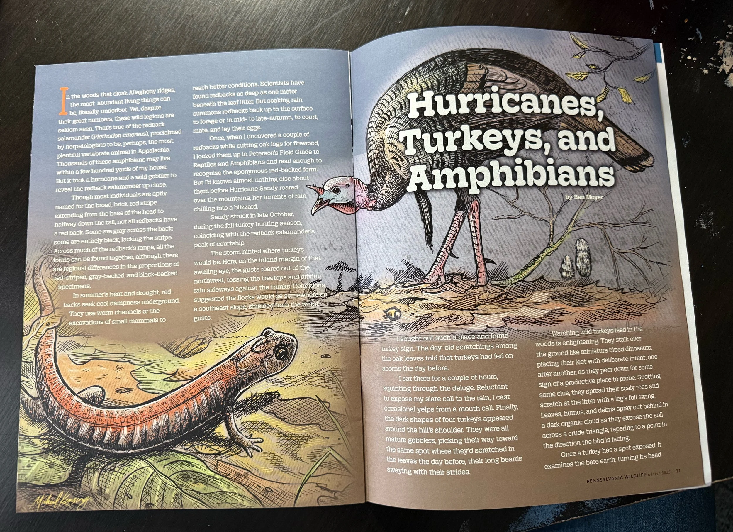 A- Not long. Usually it’s something that pops out at me based on what is inspiring me at the time. Therefore, since I enjoy the “research” aspect, I spend a great deal of time learning or digging deeper to make the article speak to readers. Most often, whatever I write about is something I feel needs to be brought into the limelight. For example, I recently wrote an article in PA Wildlife Magazine that featured “Life Beneath The Ice” - which features some species and tactics our wildlife use to survive winter. A lot of people either don’t think about that, or, they wonder about it. So I was like “Yeah, that’s what I want to write about for the winter issue!” Or sometimes I write about mushroom hunting because it’s super interesting, but also widely misunderstood.